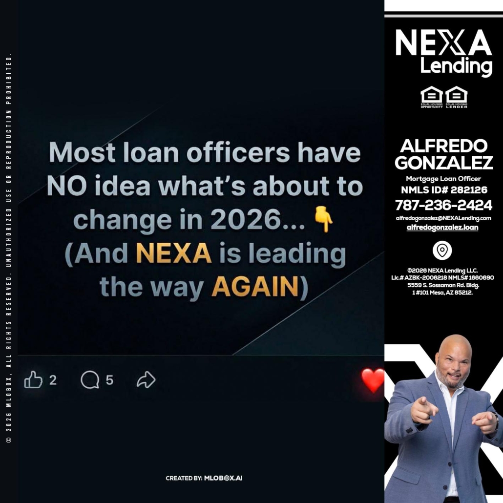 most loan officers - Alfredo Gonzalez -Mortgage Loan OfficerHi, my name is Alfredo Gonzalez. I’m a Loan Officer with NEXA Lending LLC., offering personalized mortgage solutions, fast customized quotes, great rates and service with integrity.