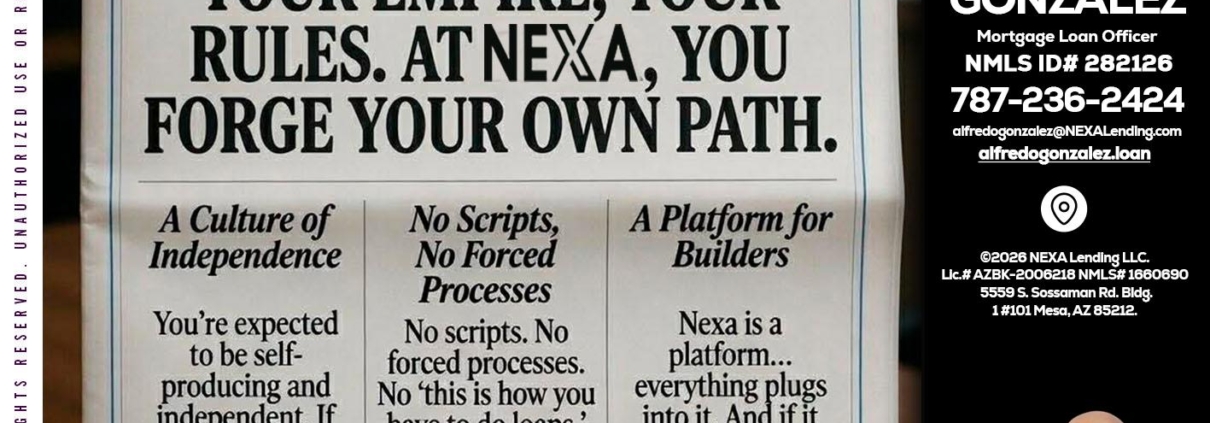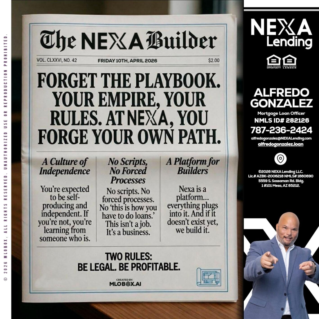 Hi, my name is Alfredo Gonzalez. I’m a Loan Officer with NEXA Lending LLC., offering personalized mortgage solutions, fast customized quotes, great rates and service with integrity.